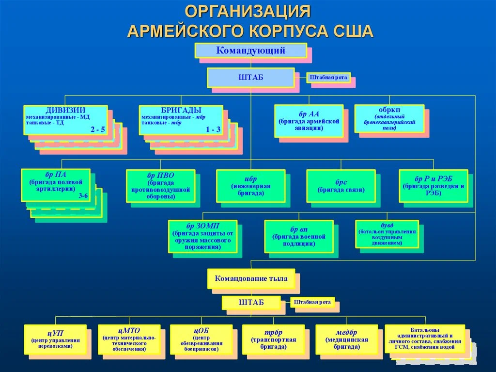 Настораживает неизвестное нам определение «Операционный Корпус». Русская и советская военная мысль знает, что такое Армейский корпус, он же Общевойсковой. Американцы тоже предпочитают понятную со времён наполеоновских войн структуру корпуса, сегодня доведённую до идеала. Три дивизии (пехотные, воздушно-десантные, бронетанковые в разных сочетаниях); артиллерийская, медицинская, инженерная и военной полиции бригады, экспедиционное командование, батальон/бригада военной разведки и россыпь вспомогательных подразделений в зависимости от географии и доступности ТВД.
