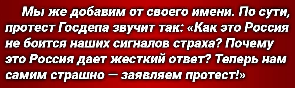 Выдвигая протест, Госсекретарь США назвал действия авиации ВМФ России, цитируем, «недопустимо жесткими». Он заявил, что американские авианосцы — это, вновь цитата, «не игрушка для истребителей военного флота РФ».