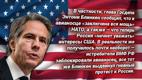 Энтони Блинкен. Источник изображения: https://t.me/nasha_stranaZМногоцелевые истребители Су-35 и Су-27 ВМФ России, выйдя навстречу авианосцу ВМС США, используя бортовые РЭБ, обездвижили судно. Су-35 продемонстрировал посадку на палубу, «глумясь» над провозглашенной мощью США/НАТО.