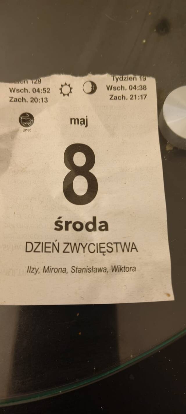Купил в Гданьске отрывной календарик. Давно таких не видел и купил. Вот отрывной листик с 8 мая. Скромненько черным шрифтом День Победы. И все. Вот так люди празднуют победу над фашизмом. О чем можно говорить.