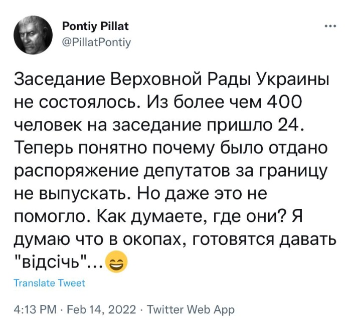 Зеленский призвал выехавших за границу депутатов вернуться на Украину КИЕВ, 14 фев — РИА Новости. Президент Украины Владимир Зеленский призвал дал депутатам Верховной рады, которые выехали за границу, сутки для того, чтобы вернуться в страну. "И я от себя лично хотел бы попросить, чтобы в течение 24 часов, они уже туда (за границу – ред.) кого-то из своих родных привезли, чтоб они (депутаты – ред.) все-таки вернулись в государство… считаю, что они должны вернуться, иначе нам надо всем как государству, как руководству делать серьезные выводы", — сказал Зеленский. Трансляцию вел офис президента Украины в Facebook. При этом он не стал уточнять, депутаты каких партий покинули страну. Зеленский отметил, что власть, в том числе парламент, должна своим примером давать сигналы народу к единству. В частности, он подчеркнул, что его семья остается на Украине, вместе с ним. Зеленский признался, что никак не может повлиять на бизнесменов, но по его мнению, им также не следовало уезжать из страны. "Также большая проблема с олигархами – здесь государство влиять на бизнес не может и не будет. Я считаю, что свой приговор для себя они уже сделали, но считаю, что они должны вернуться к своим предприятиям, к десяткам тысяч человек, которые работают на них и на государство. Они выбрали этот путь, это же не простые люди, они же не айтишники, мы говорим о людях из серьезного индустриального бизнеса, они все были участниками приватизации, государство им тоже что-то дало. Я считаю, дало им большой шанс", — заявил он. https://ria.ru/20220214/ukraina-1772762 … um=desktop ----------------- "Вернись, я всё прощу".