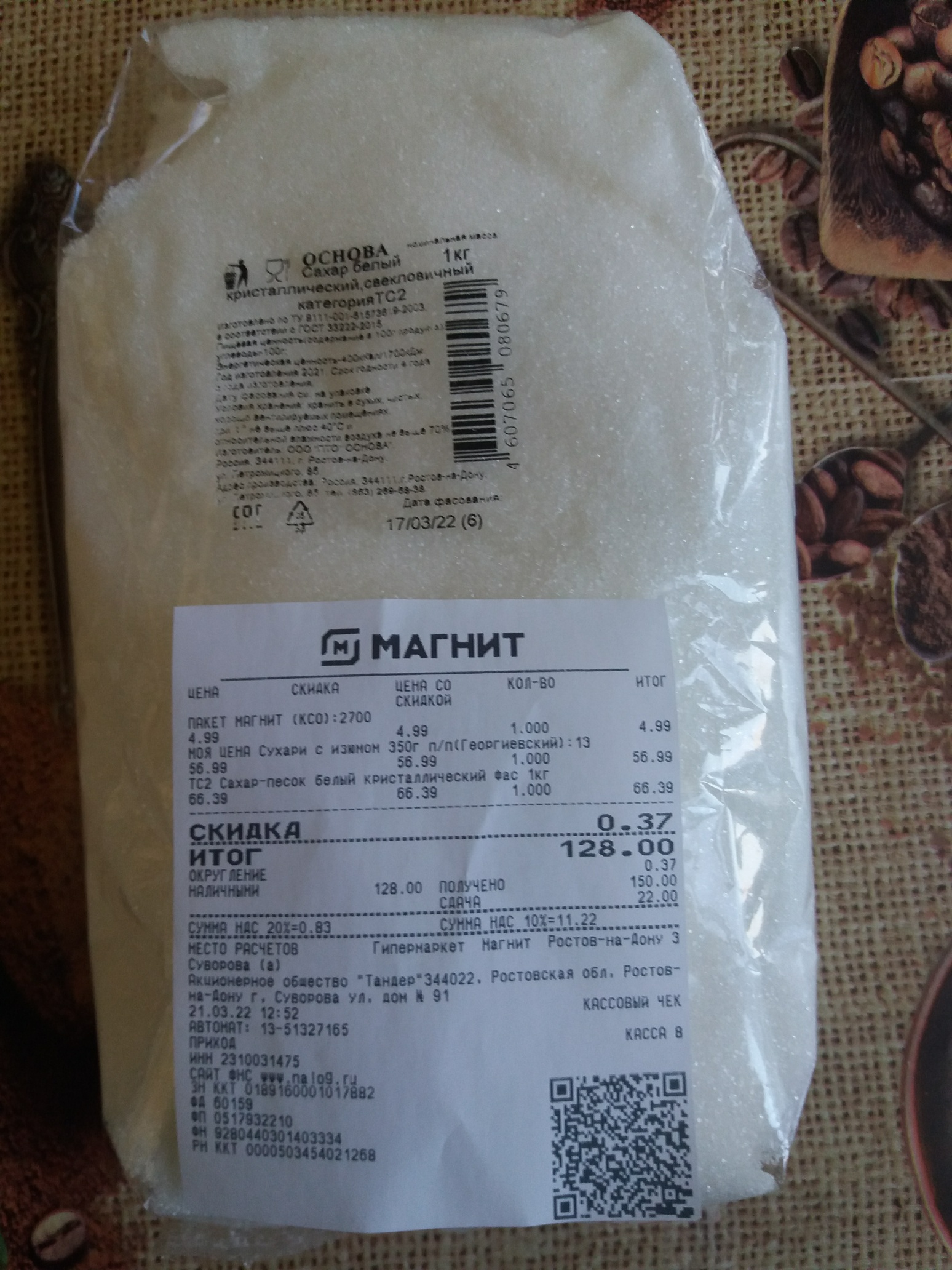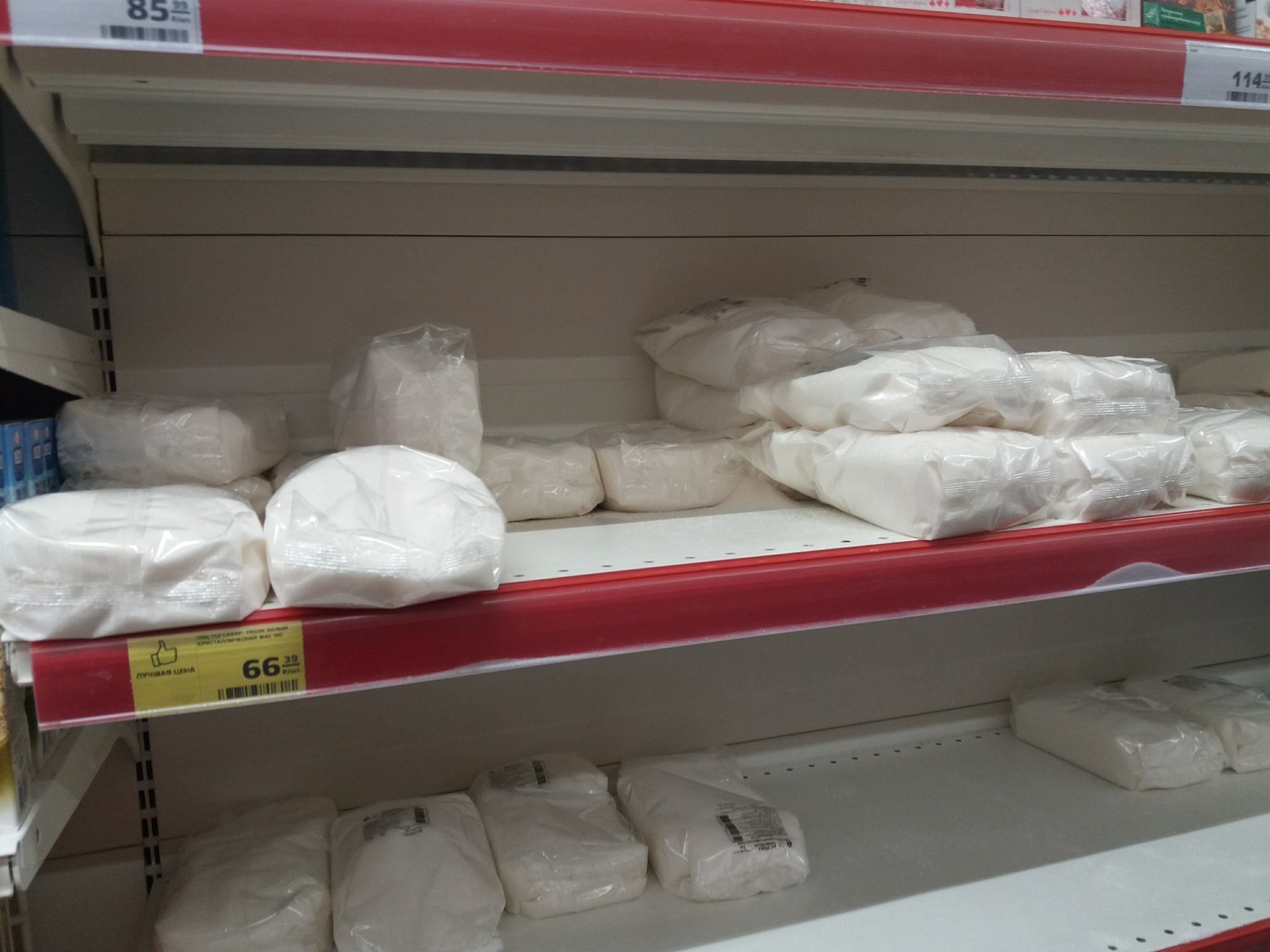 О сахаре. "Кризис" с сахаром в близлежащих "Магнитах" закончился. Как я и предполагал. Уже лежит , народ не толпится , те, кто брал на моих глазах - брали всего по 1 пачке. Я тоже купил одну пачку на 1 кг - 66 рублей. Демонстрирую