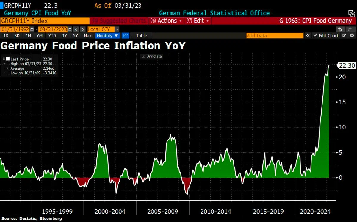 Это продовольственная инфляция в Германии. Она считается отдельно и по каким-то загадочным причинам не входит в общий индекс инфляции - как и повышение стоимости покупки и аренды недвижимости, к слову. Очень интересный принцип подсчета.