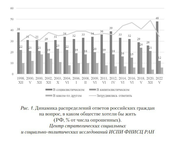 «Наибольшее число граждан выбирали социалистическое общество. За все годы мониторинга в мае 2022 г. наблюдалось наибольшее число респондентов, разделяющих данную точку зрения (48%). Капиталистическое общество предпочли 12% россиян. Затруднились ответить 34% опрошенных. В каком-то другом обществе хотят жить 6% респондентов. Для сравнения отметим, что 29% российской молодёжи ответили, что предпочли бы капиталистическое общество. Социализм оказался наиболее привлекательным для 17% молодых граждан (т.е. даже среди молодёжи нет большой поддержки капитализма)».