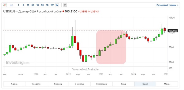 А почему это видно по динамике курса рубля? Да потому что он начал стремительно падать именно в первую половину 2023 года, как раз в этот период и происходил активный перевод расчетов из валюты в рубли. Выделил этот фрагмент на графике.