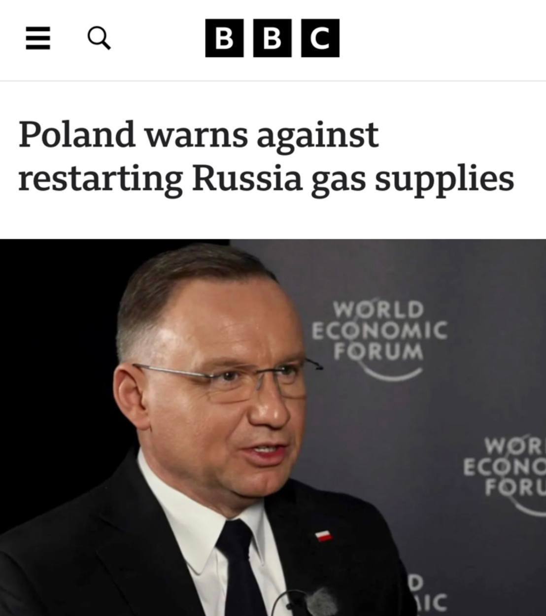 «Польша предостерегает от возобновления поставок газа из России»: Президент Польши заявил, что потоки газа из России в Западную Европу не должны быть восстановлены никогда - даже если Россия и Украина достигнут мирного соглашения.
