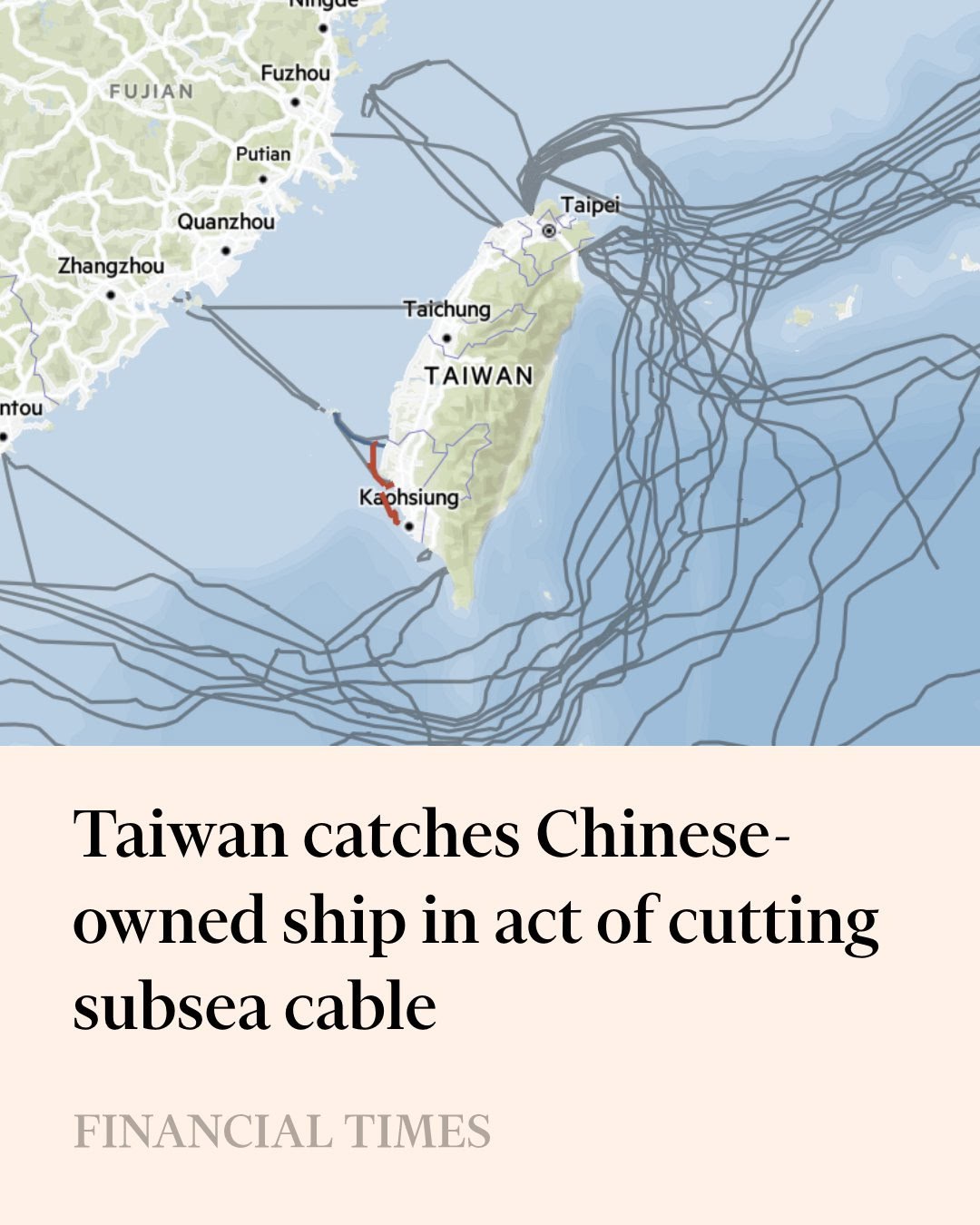 Теперь Тайвань уже не просто мычит "ну там рядом с местом где кабель проходило китайское судно, считай преступление доказано", он сообщает что прям за руку поймал. Вот прямо кабель перерезали и тут ррраз и тайваньцы остановили.