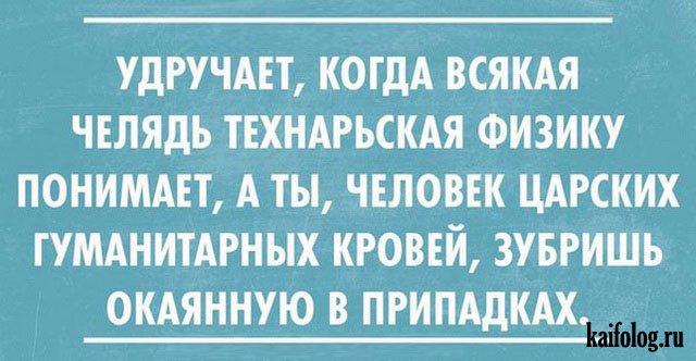 Разница между гуманитариями и технарями заключается в способе мышления. Гуманитарии много читают(в основном беллетристику, избегая технической литературы) и поэтому обладают хорошей памятью, развитой речью с возможностью цитирования прочитанного, как правило грамотно пишут, но не благодаря знаниям законов лингвистики и правил правописания, а опять же благодаря хорошей зрительной памяти, просто запоминая как правильно пишется, где ставятся знаки препинания. Практически все работы в гуманитарных науках - это суть компиляция мнений различных авторитетов, то есть берутся источники, в которых изложены выводы (причем как получены эти выводы зачастую неизвестно), и на основании этих источников и формируется труд. Чем больше источников, пусть даже противоречащих друг другу, тем качественнее гуманитарный труд. Так даже лучше - этакий налет парадоксальности.