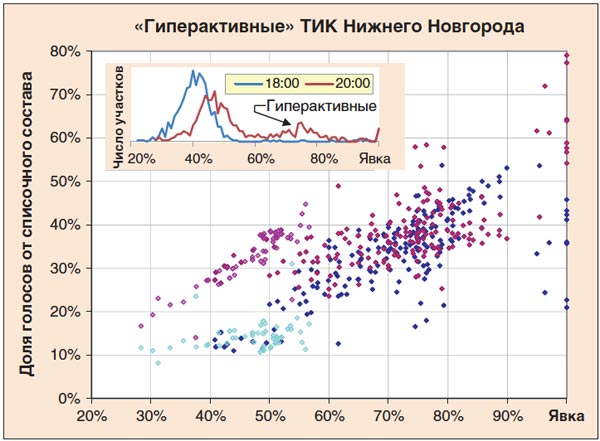 Наконец, интересно, как менялось распределение числа участков по явке в течение дня. В 12, 15 и 18 часов наблюдается характерное для случайных процессов колоколообразное распределение. А потом вдруг появляется второй «горб» на значениях явки 70–80%. Это и есть участки из «гиперактивных» ТИК с повышенной явкой в последние два часа голосования, на них приходится 45% всех голосов по Нижнему Новгороду. Если среди читателей есть поклонники Шерлока Холмса, они могут интересно провести время в поисках версий, объясняющих всю эту совокупность явлений.