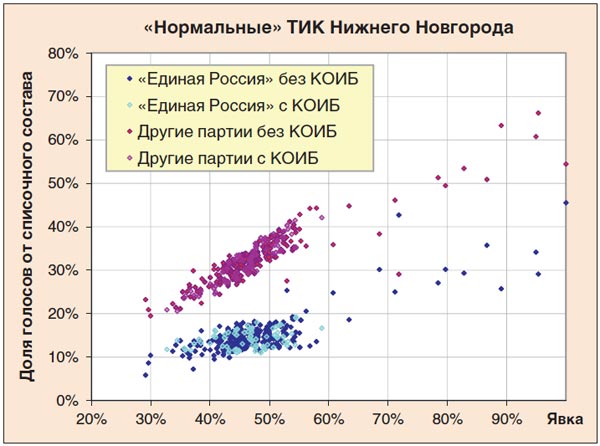 Странный эффект очень хорошо виден на диаграмме, явка соотносится с процентами голосов, которые получили партии. У пяти «нормальных» ТИК точки по участкам с КОИБами и без них ложатся довольно кучно. А вот у «гиперактивных» ТИК участки без КОИБов срываются с мест и прыгают в область высокой явки, причем доля ЕР увеличивается вдвое, а доля остальных партий почти не меняется.