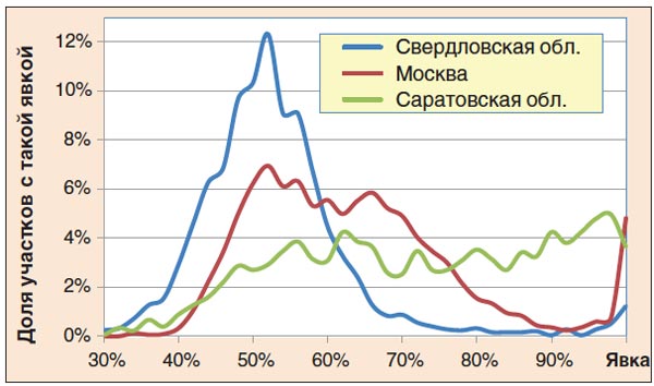 В связи с этим интересно посмотреть соответствующие распределения по отдельным регионам. Оказывается, в значительном числе субъектов Российской Федерации распределение участков по явке на прошедших думских выборах имеет вполне симметричную колоколообразную форму, еще в части субъектов «колокол» имеет «хвост» или второй «горб», и лишь в некоторых регионах распределения искажены причудливым образом. При этом прослеживается четкая закономерность: чем выше доля голосов партии власти по региону, тем больше отклоняется распределение от колоколообразной формы.