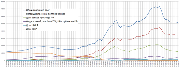 Вот тут Падре внешний долг по годам, с того же сайта, откуда график брали и вы. Не знаю насколько будет наглядно, но вы можете в Википедии его посмотреть. Так вот, оценка ушедших из России денег в 2014 году не 150 миллиардов. 150 миллиардов это только покрытие внешнего долга государства. Там есть еще негосударственный без банков, долг банков, кроме центробанка. И так далее, так вот, на глазок у меня под 250 миллиардов, на первое января 2015...это при том, что и ЗВР уменьшился на 130 миллиардов. Включили они его в эту сумму или нет, не знаю. Пусть это с учетом ЗВР. По версии ЦБ ушло из станы за год 250 миллиардов. Почти все в последние пол года 14го. Это примерно 15 процентов ВВП. Смысл в таких денежных комбинациях?